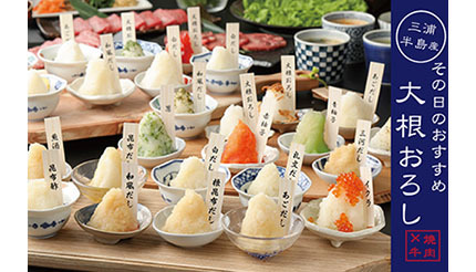 モンテローザは、焼肉店「焼肉X牛(やきにく エックスぎゅう)」で大根おろしと楽しむ黒毛和牛を含む「焼肉食べ飲み放題スタンダードコース」4月12日から販売する。三浦半島産の大根を使用している。