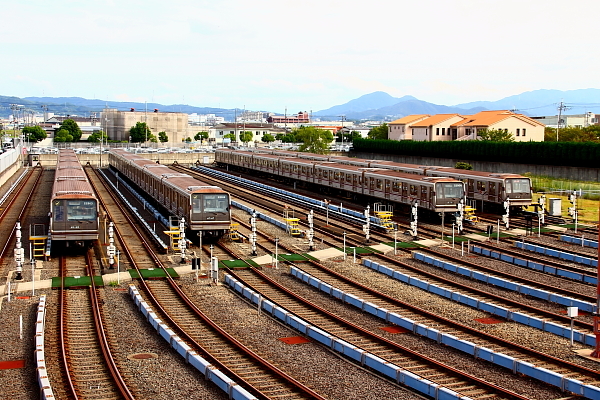八尾南駅に着くと、こんな光景が広がってました。谷町線車両の群れ、バーン! その向こうには、生駒山地の連なりが見える。このレール群と稜線の組み合わせが違和感たっぷりで、不安と興奮をおさえるべく、まずは深呼吸……。
