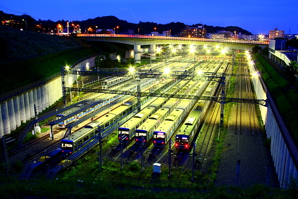 小田急多摩線の唐木田駅に隣接する車両基地。小田急の車両のほかに、乗り入れ先の東京メトロ千代田線の車両などが停泊する。小高い山々に囲まれ、すり鉢状の谷間にあるような基地で、一般道から車両群を見下ろすことができる。また、この南側に鶴見川の源流域があり、緑に囲まれた湧水エリアで深呼吸するひとときも体感できる。