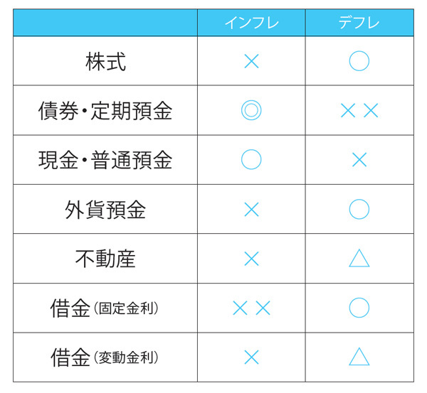 この表の内容は一般的、常識的なもの。実際には、株価、金利、為替レートのいずれも、将来のデフレやインフレがマーケットで完全に予想されている場合には、違った動きになることも考えられる。