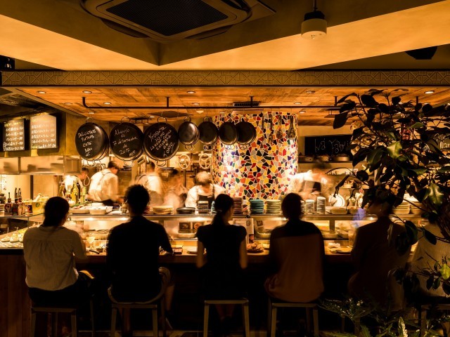 古典的な空間に都会的スパニッシュモダンを融合させた大人の社交場。スペインならではのモザイクタイルやアーチ状の天井などを用い、クラシカルな空間をベースにハイセンスなモダンスパニッシュをエッセンスにフュージョン。又、立食、ハイチェア、ローチェアと3段階のテーブルをつくることにより、目線が重ならない細やかな立体的フロアを演出し活気を溢れる店内となっています。