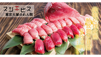 スパイスワークスは、「スシエビス 東京大塚のれん街」(東京都豊島区)で生産者・仲卸応援企画「鮪放題!本マグロびんちょうマグロ握り寿司食べ放題90分999円!(税抜き)」を4月17日から開催する。税込み価格は1099円。