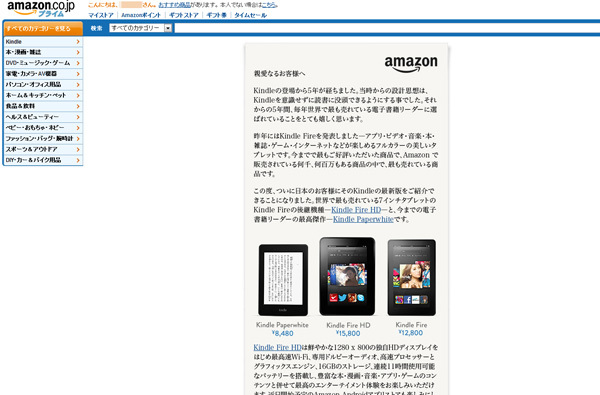 製品ラインナップには、6型の電子書籍リーダー「Kindle Paperwhite」の他、7型カラー液晶のAndroid タブレット「Kindle Fire HD」、その廉価版で「Kindle Fire」が用意されています。