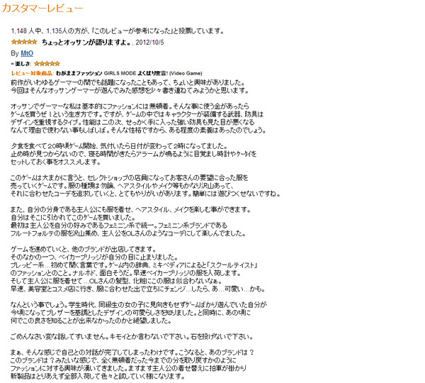 ニンテンドー3DS用ソフト「わがままファッション GIRLS MODE よくばり宣言!」のAmazonページに30代男性のユーザーが熱いパッションほとばしるレビューを投稿して話題になっています。
