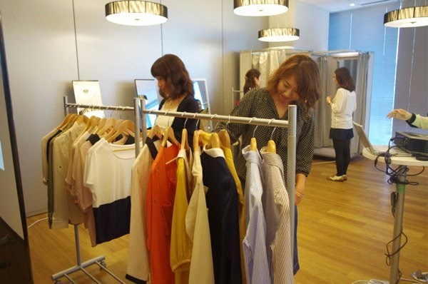 今回はミクシィ社で行われた試着会におじゃましてきました。広い会議室の一角がアパレルの展示会場のようなコーナーとなっていました。9月と10月のコレクションがずらりと並んでいて、その横でPetite jetéのチームメンバーが対応してくれます。