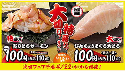 とろけるような口どけの「大切り!びんちょうまぐろ大とろ」と、香ばしく炙った脂のりの良いサーモンをたっぷりのせた「特盛り!炙りとろサーモン」を、期間限定で110円で提供する。