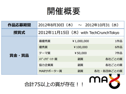 まずはじめに、Mashup Awards実行委員会の事務所の伴野智樹さんから、「Mashup Awards 8」(MA8)についての説明がありました。