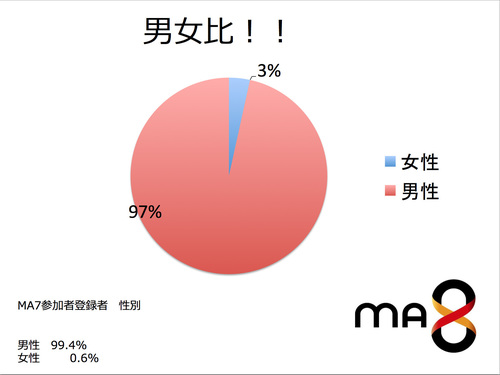 今回初めて参加者が全員女性というワークショップを企画した理由は「通常のイベントは9割以上が男性」という現状を打破し「もっと女性にも参加してほしい」との思いから、イベントを企画したとのこと。確かにこの割合は.....。
