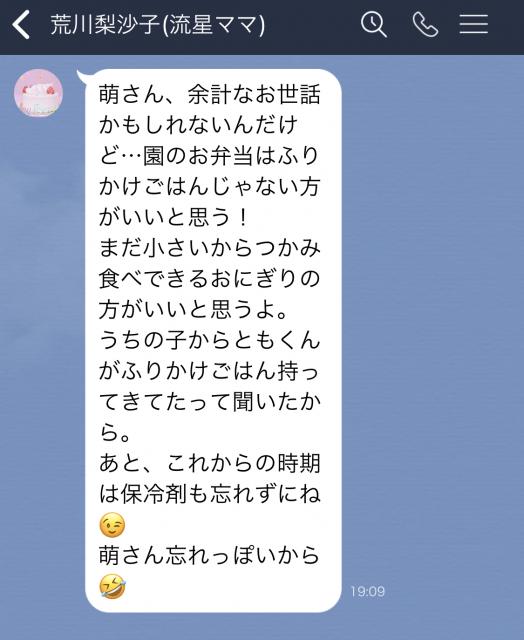 『まだ小さいから、つかみ食べできるおにぎりのほうがいいと思う』『これからの季節は保冷剤も忘れずにね』と、ダメ出しのオンパレード。