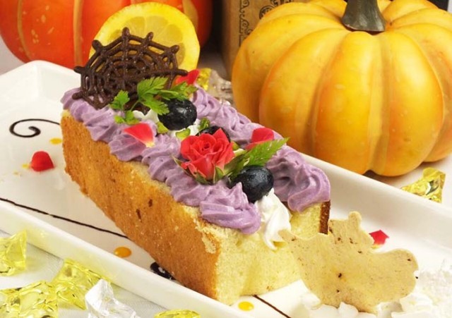 ふんわり柔らかいスポンジに紫芋のクリームとオレンジに漬けたレモンがアクセント。