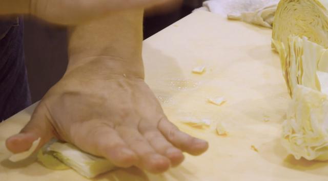 葉を重ねると高さがあり切りにくいので、キャベツを手でたたいて平らにすると切りやすい。