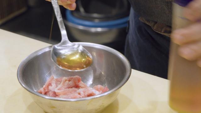 6.お肉の下処理をします。塩少々、コショウ少々、お酒大さじ1.5(お肉100gに大さじ1)を入れて、お肉を軽く揉みます。