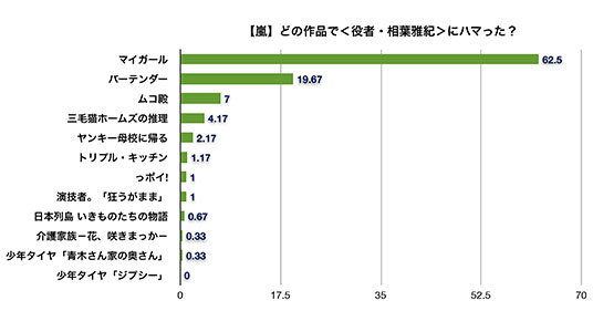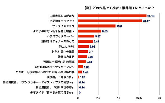 そして大野智、相葉雅紀が出色のセンスを発揮したのがバラエティ。冠番組『嵐の宿題くん』('06~)は今回の投票結果を見れば歴然、断トツで支持を浴びている。'02年から深夜番組『Cの嵐!』『Dの嵐!』『Gの嵐!』で培ってきたバラエティ力を結集し、笑えるチープ感は残しつつも24時台らしいポップなパッケージに仕上げたことが功を奏した。放送期間も'06年~'10年の3年半と比較的長く、この時期が即ち嵐のブレイク第二期を完全にカバーしている。