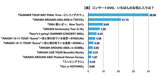 2位には初の東京ドーム公演、4位には10周年の記念ライブ、とファンにとってメモリアル要素の強い大規模公演が並ぶ中、3位と5位にやや古めの『いざッ、Now』('04年)、『How’s it going?』('03年)が食い込んでいることも見逃せない。前者に収録の大野のソロ『TOP SECRET』に代表されるような、脂の乗り始めた各メンバーの表現スキルは一見の価値あり。また特典映像の見応え、マルチアングルの導入など小技の利いた造りも、この2作品の人気におそらく関係している。