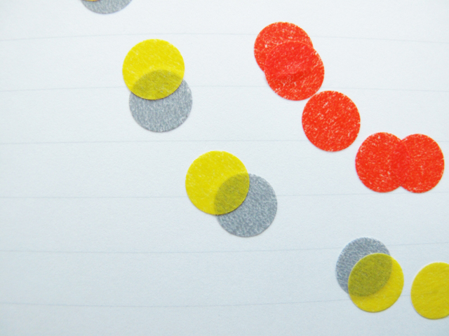 このシールには、もうひとつの使い方があります。それは「画材として使う」。全13色×直径8mm/16mm/20mmの3サイズ(各294円・税込)を展開するこの丸シールは、メッセージカードのアクセントや、パーティの飾り付けなどでも気軽に使える画材にもなるとのこと。さっそく自分も、8mmバージョンを使って作ってみることに……。