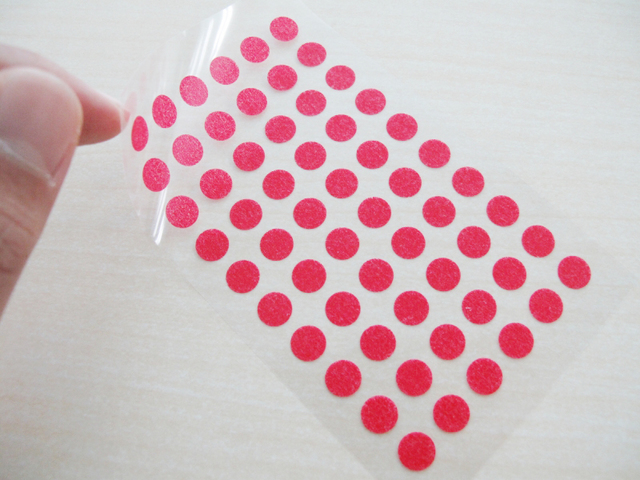 商品名は「マスキング丸シール」。スケジュール帳などによく使う丸形シールは特に珍しくないですが、この商品の特徴はマスキング素材であること。当然、貼り直しも可能です。また和紙を使用しているため微妙にスケスケになってて、貼った後ろの文字も見えます(色によっては見えないこともあり)。