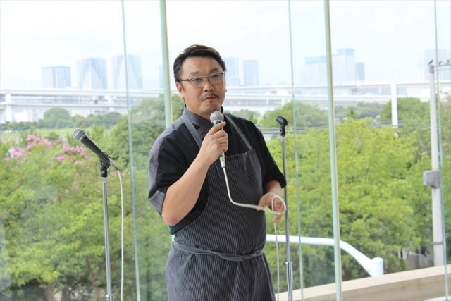続いて総料理長・水口雅司氏からのコメント。見た目は少しグロテスクですが、あくまでもどうしたらおいしく食べてもらえるかを追求。およそ3ヵ月も試行錯誤を重ね、かなり完成度の高いものができたとのこと。あえてひとつのメニューに使用する素材も2、3種類にし、素材を生かしたシンプルな仕上がりになっています。