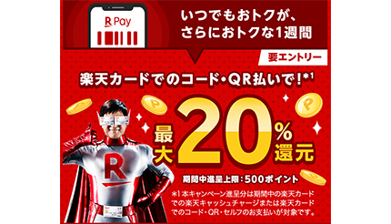 楽天の「楽天ペイでいつでもおトクが、さらにおトクな1週間!楽天カードでのコード・QR払いで最大20%還元!」