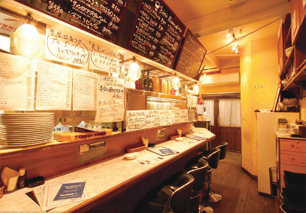 路地裏にある隠れ家的な佇まい。ビールはエビス生ビールが一杯300円、各種ワインもグラス一杯300円~とロケーションから考えると信じられないようなコストパフォーマンスを実現しており、グラスワインだけで約30種類を揃える。