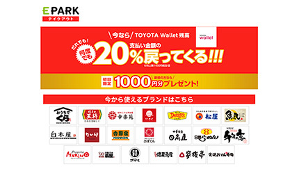 期間中、EPARKテイクアウトで事前注文の支払いの際に、事前チャージ(プリペイド)型電子マネー「TOYOTA Wallet残高」を利用すると、利用金額の20%を還元する。キャンペーン開催期間中は、何度でも利用可能。還元上限は1回1000円。つまり、支払額5000円以下なら20%還元となる。