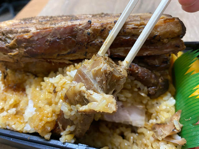 なんと、食べ進めるとご飯の下からまた極厚の焼豚が登場。この厚みが中に入っているということは、確実にご飯の厚みよりも焼豚の厚みの方が何倍も上!こんな贅沢でいいのでしょうか。