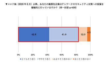 コロナ禍の2020年3月以降、勤務先企業によるテレワークのセキュリティ対策への投資に関する質問では、「とてもそう思う(42.8%)」と「そう思う(41.0%)」という回答が全体の8割以上を占めた。