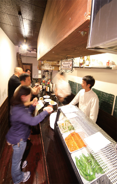 店舗のある地下1Fに下りると、そこは多くの客で賑わい、笑顔と活気の溢れるアットホームな空間が広がる。そのムードからか隣り合わせた客同士が語らい、自然と仲良くなることも多いのだとか。オーダーはチケット制で、全て1品315円というお手軽さも嬉しい。