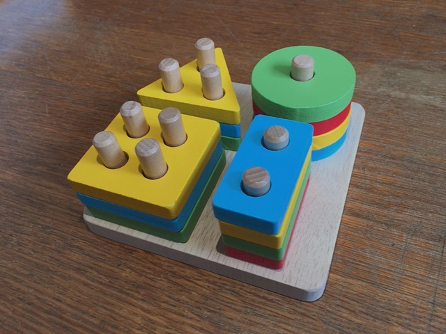 まずは「Aning 幾何学型型はめパズル」をご紹介。幾何学模様のブロックを棒に挿して遊ぶおもちゃです。