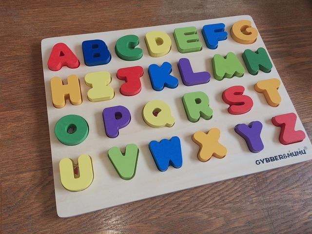 型はめと一緒に英語の勉強もできる「GYBBER&MUMU アルファベット型はめパズル」。
