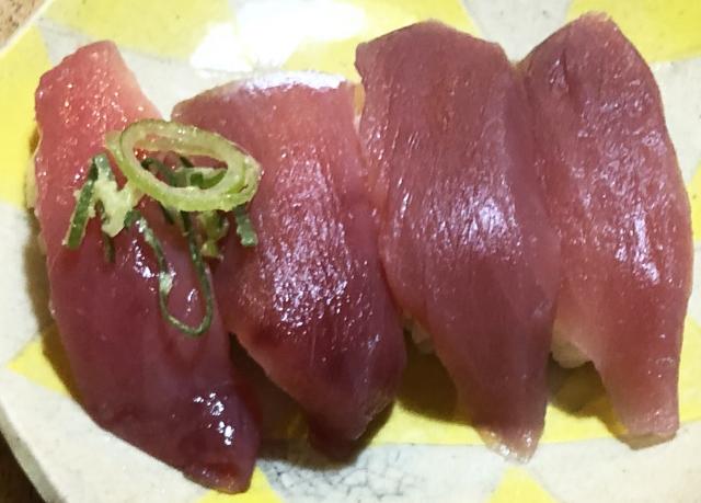 前述のようなまぐろ赤身での優等生的な味に対し、醤油、みりんなどの漬け汁のインパクトが強まり、最も個性的な味に変化しています。目をつぶって食べたら、それが「まぐろである」と絶対的に判断できないほどの味変です。