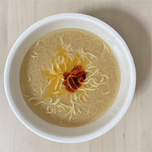 店頭で食べる麺はそうめんのような白さですが、カップラーメンの方は少し黄色っぽい印象がありました。