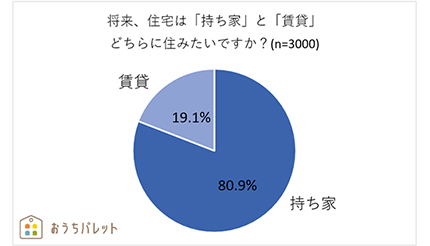 将来、住宅は「持ち家」と「賃貸」どちらに住みたいかを聞くと、約8割の人が「持ち家」に住みたいと答えた。現在は、持ち家が圧倒的に人気のようだ。続いて、「持ち家派」と答えた人に、「マンション」と「戸建て」どちらに住みたいか聞いてみると、将来持ち家に住みたい人のうち約77%が「戸建て」に住みたいと回答した。