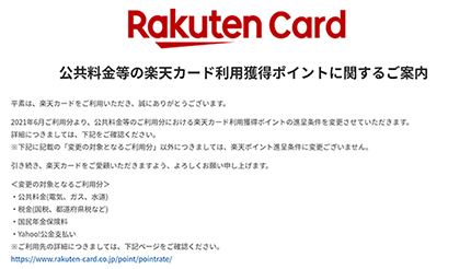 しばしばスマートフォン(スマホ)決済サービス「楽天ペイ(アプリ決済)」の還元キャンペーンの参加条件となっている「楽天カード」を発行する楽天カードは、2021年6月利用分から、公共料金など対象の支払いについて、カード利用額に応じて対応するポイント付与率を大幅に引き下げる。適用開始日は6月1日。