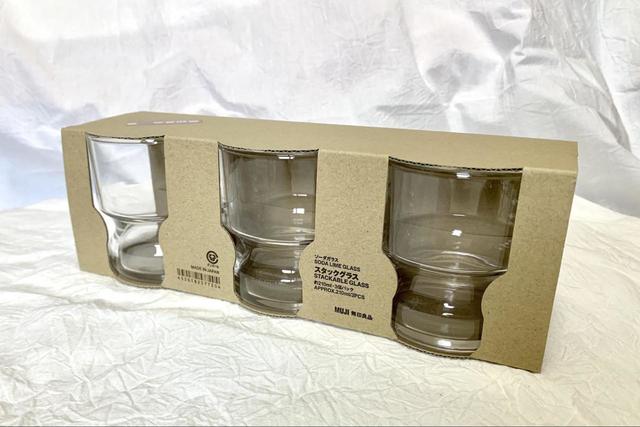 スタッキングできる無印良品のガラスグラスのセット。3個入りで容量は約210ml、価格は499円です。