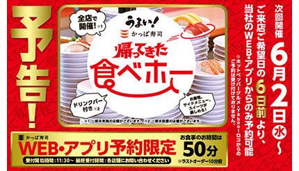 コロワイドグループのかっぱ寿司は6月2~13日の12日間の期間限定で、かっぱ寿司全店で食べ放題の「食べホー」を実施する。利用料金は、一般が2200円、シニア(65歳以上)が1700円、小学生が1200円、4~6歳が500円、3歳以下が無料(保護者1人につき2人まで。3人以降は1人につき500円)。延長料金が550円/1人30分となる。5月27日から予約を受け付ける。