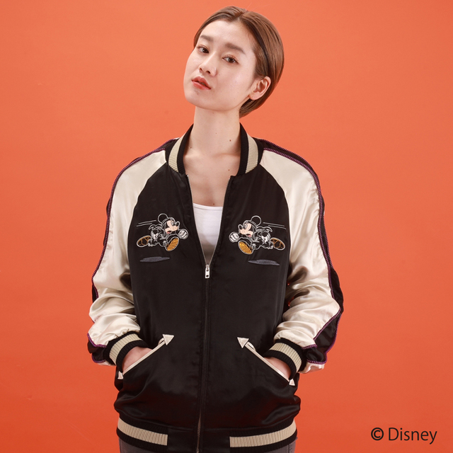 背面に軽やかに飛び上がるミッキーマウスがあしらわれたコーチジャケット。