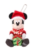 クリスマスらしい赤と緑を基調にしたコスチュームのミッキーぬいぐるみ。