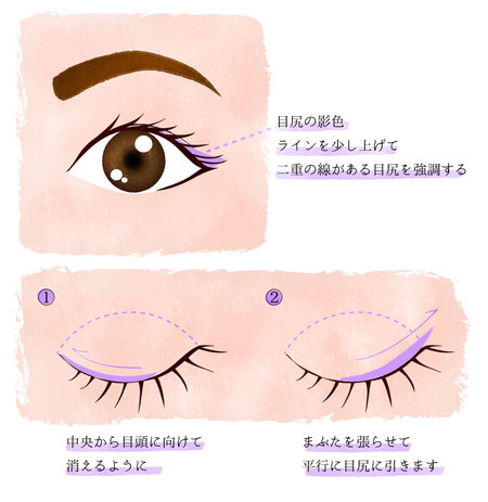 目尻側は少しハネ上げてアクセントをつけると、目尻の二重の線が強調されて腫れぼったさがなくなりますよ。