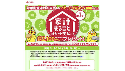 NTTドコモは、自社のクレジットカード「dカード」と共通ポイント「dポイント」の利用促進として、2020年6月1日から実施している「家計まるごとdカードのお支払いがおトク!」キャンペーンに、21年6月から「保険」カテゴリーを追加すると予告している。