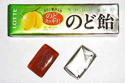 ロッテから出ている「のど飴」! ストレートなタイトル、カリンのイラストが頼もしい感じがします。飴のルックスもこれ以上無いノドアメらしさ。13種類のハーブエキスが入っているらしく、かなりスースー、スッキリ感。スタンダードな味なので飽きにくい作品に仕上がっています。万が一飽きても「フルーツ味」などの他のバリエーションもあります! 99円。