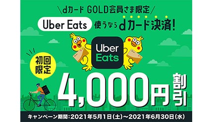 NTTドコモは、自社のクレジットカード「dカード GOLD」会員への顧客還元として、エントリー不要のdカードGOLD会員限定キャンペーン「Uber Eats使うならdカード決済で4,000円割引!(初回限定)」を5月1日から6月30日23時59分まで実施している。