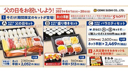 元気寿司は6月1~20日の期間、寿司レストランチェーン「元気寿司」「魚べい」において家族で父の日を祝える「父の日セット」「盛り巻きセット」「バラエティセット」を販売する。