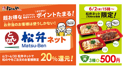 松屋フーズは、とんかつ専門店の「松のや・松乃家」で、6月2日午後3時から「松弁ネット会員様限定500円弁当」を発売する。また、お弁当ウェブ予約サイト“松弁ネット”で導入している松弁ポイントの「20%ポイント還元キャンペーン」を6月2日から30日までの1か月限定で開催する。