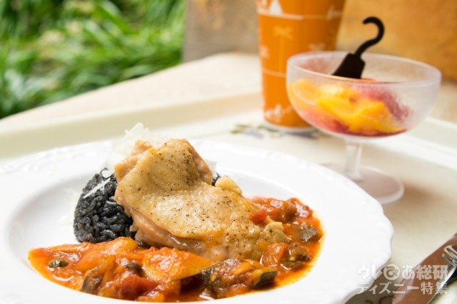 ・イカスミのバターライス、チキンのトマト煮込み添え