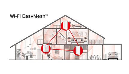 同社では今回、住環境に合わせて隅々まで届くWi-Fi環境を提供するため、メッシュネットワークの業界標準であるWi-Fi EasyMeshに対応する。これにより、親機のみでは家の隅々までカバーできない場合でも、中継機を用いて誰でも簡単にWi-Fiエリアを拡げ、安定的な環境を構築できるようになる。