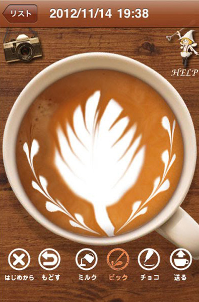 iPhoneをタッチして、ミルクや、チョコペンでラテアートを作って遊べるアプリ。