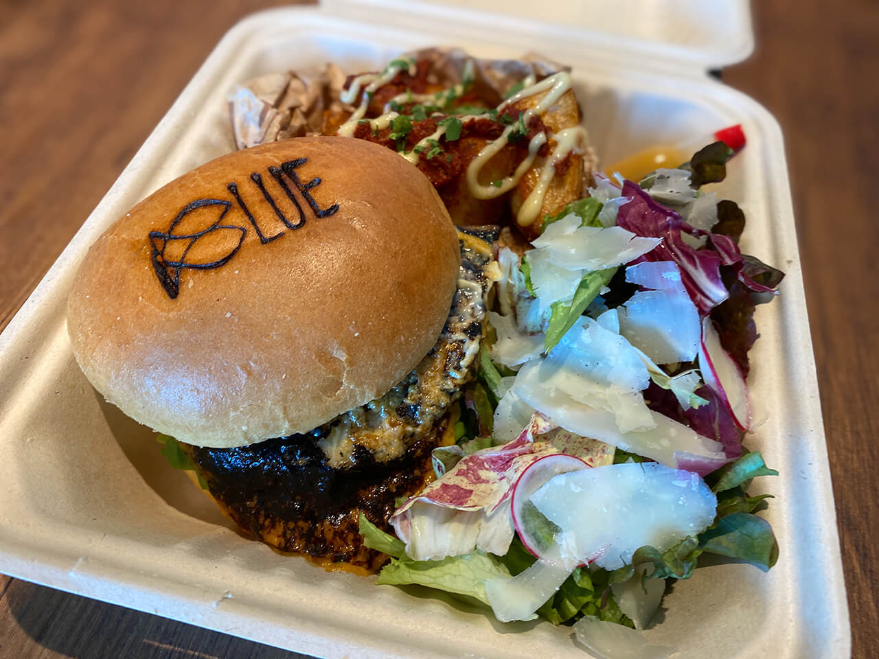 バンズにお店のロゴが入ったハンバーガーはランチで販売。ポキは夜もテイクアウト可能です。