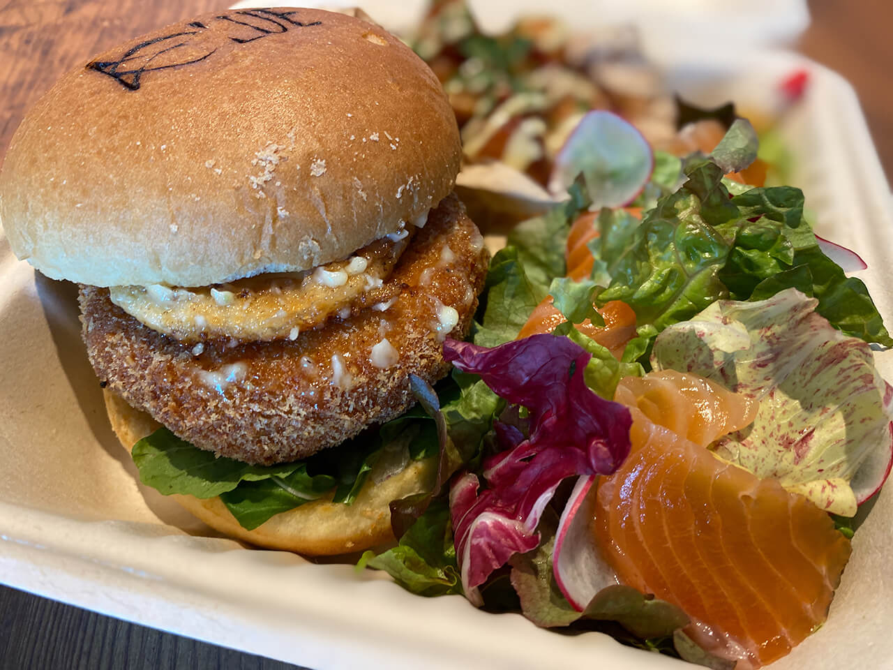 ASC認証のノルウェーサーモンを使用した「タルタルサーモンバーガー」は、同じくサラダとカリトロポテト付き!
