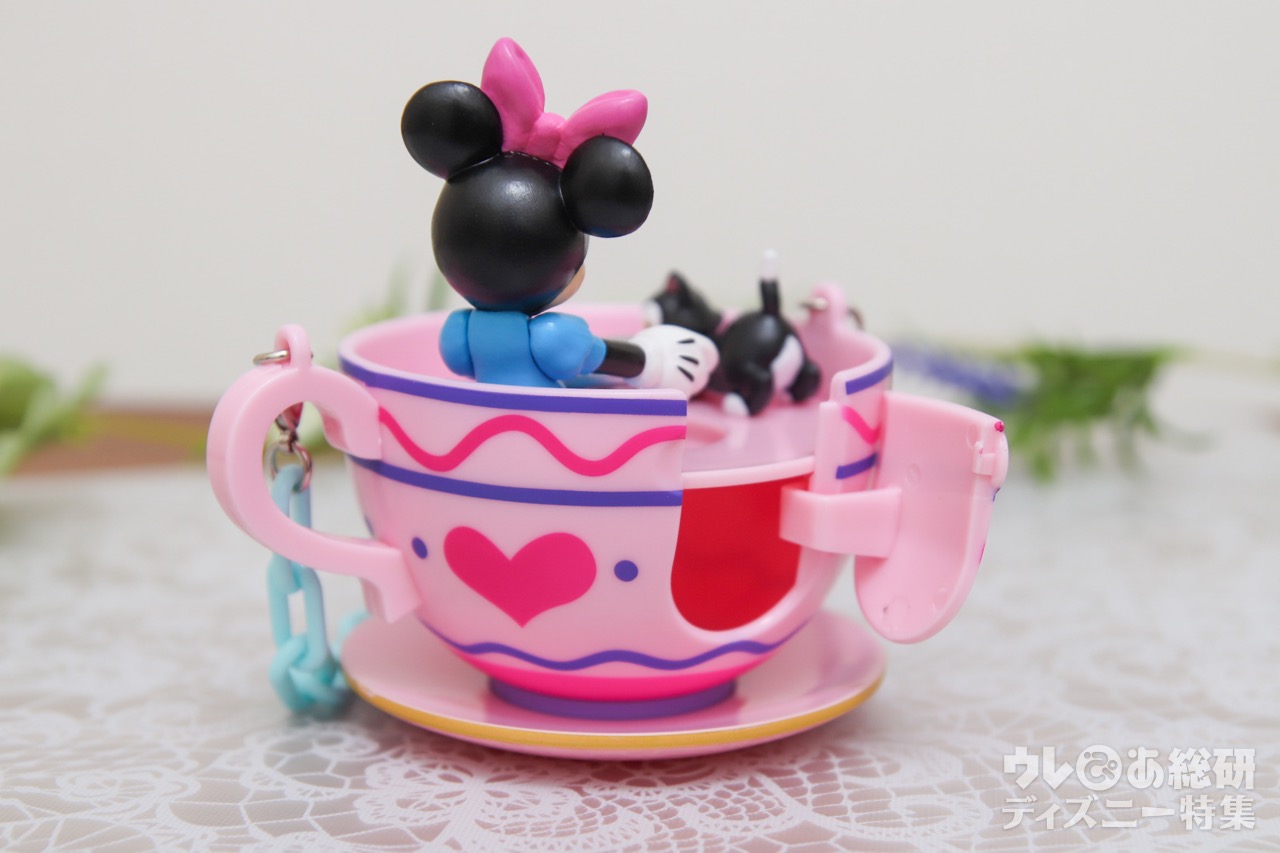 ピンクにハートのデザインのティーカップには、ミニーちゃんとフィガロが乗っています。