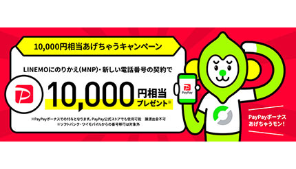 ソフトバンクは、オンライン専用ブランド「LINEMO(ラインモ)」に乗り換えると1万円相当をプレゼントする「10,000円相当あげちゃうキャンペーン」を6月5日に開始した。